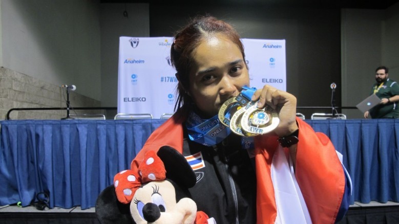 Miss Thunya Sukcharoen, Thai woman weight lifter in body weight 48 Kg. class snatched 86 Kg. to win the first gold medal for Thailand team but had to settled for a silver medal in the Clean and Jerk with 109 Kg. and another silver medal in the overall weight with 193 Kg. at the World Weight Lifting Championship, held at Anaheim city, California State, the United States of America on 27 November 2017.